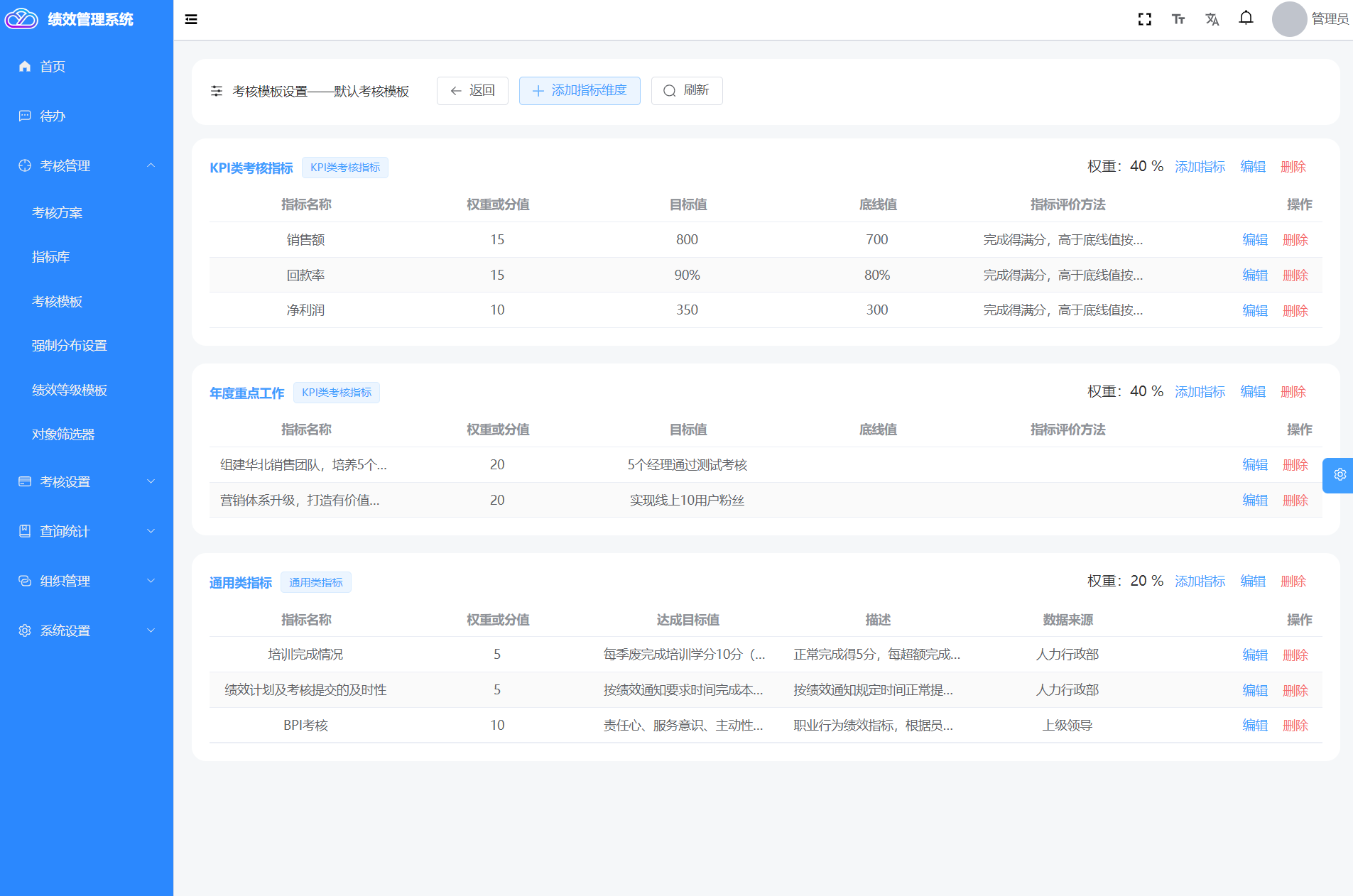 考核工作一键启动,考核结果自动统计,可以轻松组织大规模的考核工作,支持年度、季度、月度考核,流程灵活定义。